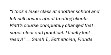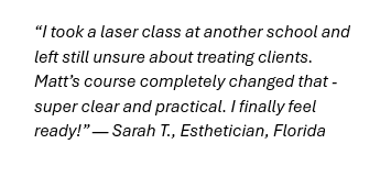 Through structured instruction and mentorship, students develop the knowledge, technical awareness, and clinical judgment required to work responsibly with aesthetic laser devices.